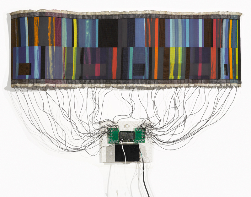 Media: Hand-woven cotton, rayon, conductive yarns, silver ink, thermochromic ink, drive electronics and software. 62" x 54" x 8".