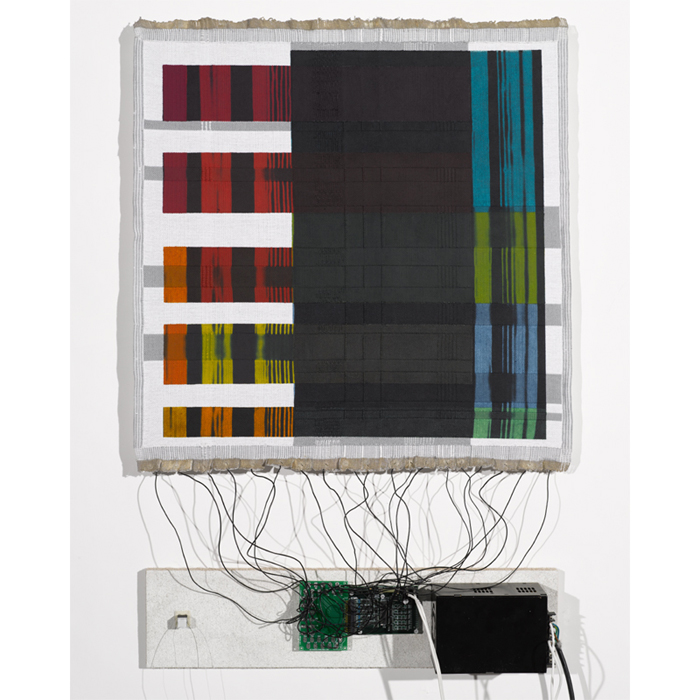 Blip uses a minimalist vocabulary and presents the electronics and wires as sculptural elements. This 16 pixel piece is printed on a grey and white double weave. Large yarns are bundled with conductive threads to give texture to the surface and changing color areas. |
