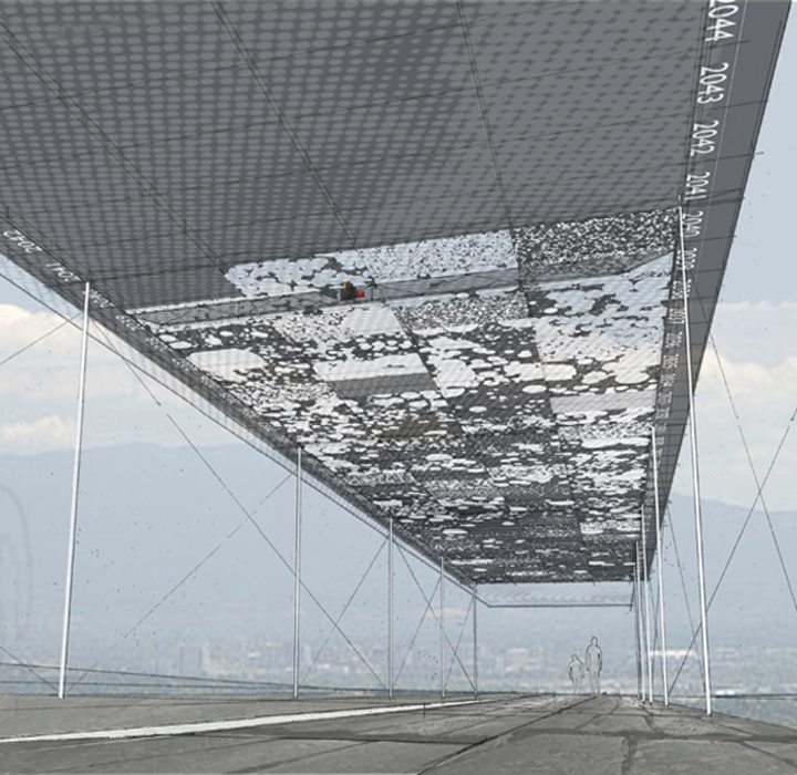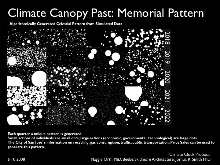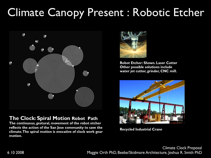 This architecturally-scaled work takes the form of a canopy whose material seams create the grid of a 100 year calendar. Each block of the canopy grid represents one season or quarter. As the community takes positive action toward climate change, the dark, carbon-like material (made from recycled materials such as glass or rubber), is etched away from the canopy, revealing the sky above and allowing light to reach the ground below. The more action the community takes, the more dark material is removed, revealing more light. Small, individual actions take the form of small dots. Larger, community, technological and government actions take the form of large dots. Dots are then randomly placed with a Monte Carlo algorithm, creating a celestial effect. The future of the climate, based on quarterly actions, is predicted by the LED array layer, which displays a dynamic and impressionistic, cloud-like visualization. The more actions San Jose takes, the brighter the LED pattern and the less clouds. The robot and LEDs are powered by solar cells integrated into the canopy structure. On line, viewers can use a GUI version of the robot arm to scroll through each city’s clock, accessing the specific climate data and community actions of each quarter, and observing how the actions of each season predict a different future. An educational kiosk, located at the future end of the canopy, draws the viewer through the canopy and the covered park like space, and provides an opportunity to access the climate data on line.