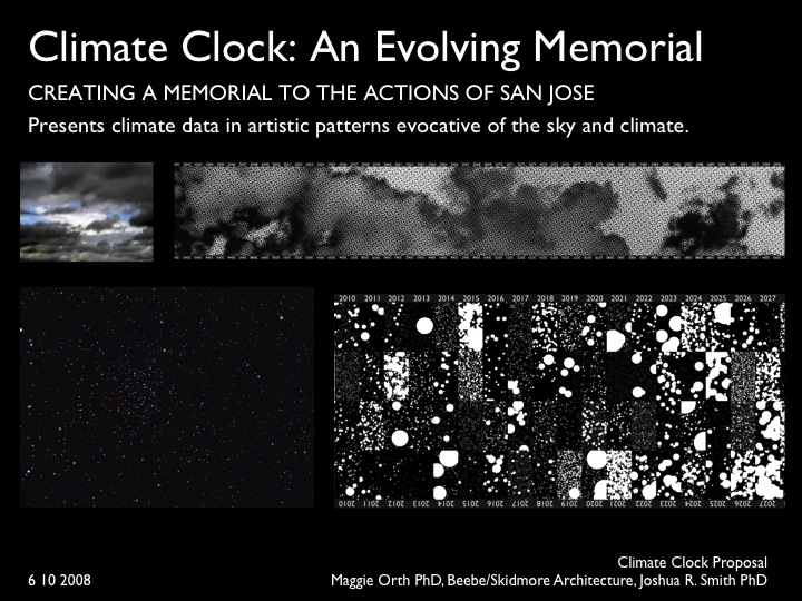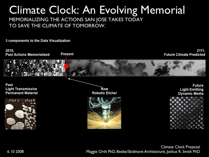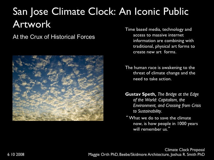 The San Jose Climate Clock (SJCC) is a groundbreaking public artwork which comes at a defining moment in human history. The world is awakening to the fact that human actions are dramatically affecting the environment and causing rapid climate change. The actions we take today to prevent climate change will be the defining historical events of our time. At the same time, technology and digital media are revolutionizing access to information, human communication, and creating radically new, time based art forms. The SJCC lies at the crux of these historical forces. It is a new type of public artwork which challenges artists to combine complex data and time-based digital media, with the tradition of permanent landmarks, memorials and site specific art, while motivating the public into positive action to prevent climate change.