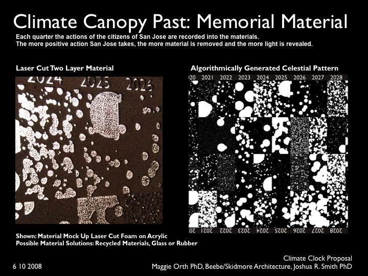 1) A permanent, carbon-like, memorial material into which an algorithmically generated pattern based on the climate saving actions of the San Jose community over 100 years is etched.