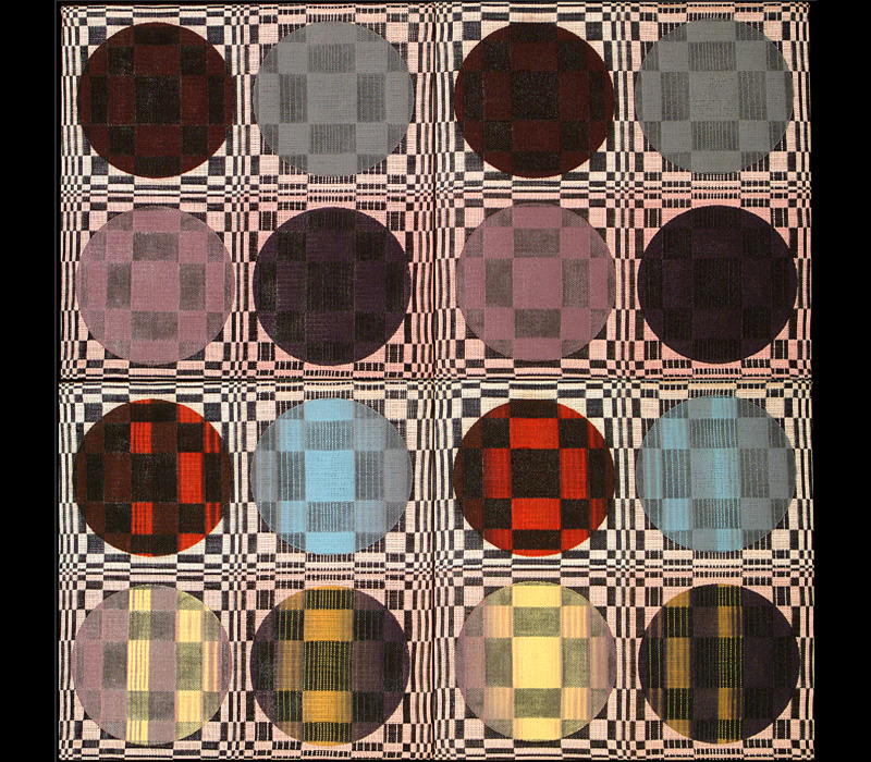 Media: Hand-woven cotton, rayon, conductive yarns, silver ink, thermochromic ink, custom drive electronics and expressive software. 8 eight-pixel units. 56"w x 28"h. link to video Dunamic Double-Weave explores how a repeated textile pattern can interact with a repeated software pattern. Each textile repeat element has four printed circles and eight woven textile pixels, or color change areas. Software can turn on any of these eight areas, in any combination, creating a software repeat or primitive. Color change textiles combine electrodes woven with conductive yarn, thermochromic ink, drive electronics, and expressive software. Textile electrodes are woven with highly conductive yarns in the warp, on the selvedges, and resistive yarns in the weft. Plain weave connects these yarns together electrically. Selvedges are cut to create individual color change areas, and connected to drive electronics. The weaving is printed with thermochromic ink, which changes color when heated. Drive electronics send current to the individual pixels, heating the resistive yarns and changing the color of the ink. Expressive software controls the patterns and sequences of the color change events. |