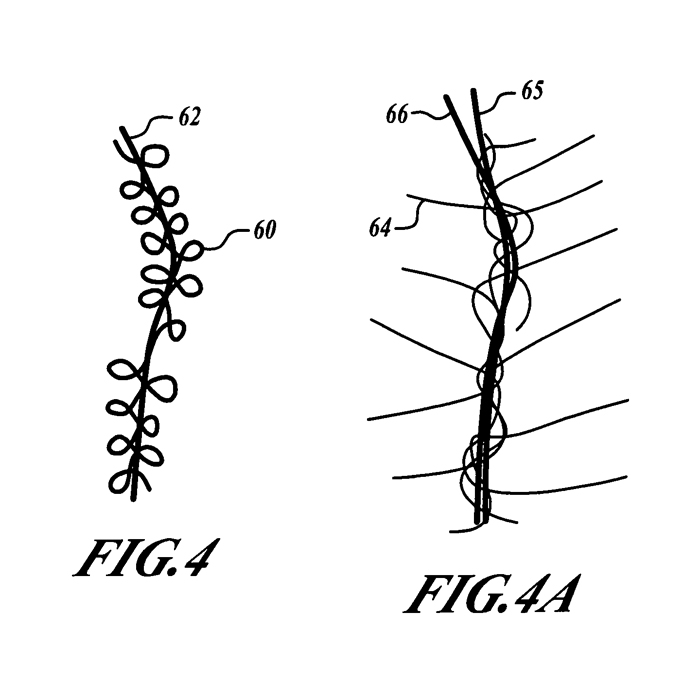 Un-issued patent applications: I love the idea of a patented conductive eyelash yarn, but this one didn't get approved! But its too fun not show. The eyelash yarn is made with nylon/stainless steel core and metalized nylon lashes. See the image under "yarn. |