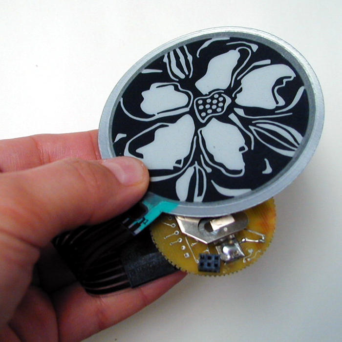 with Joanna Berzowska Media: 8 segment bi-stabke E-ink display. This early E-ink display was made at IFM. The concept was to create "modules" that could be inserted into different peices of fashion. The animation sequence shows teh surprizing number of patterns possible with just 8 pixels. This led to my work in color-chage textiles.