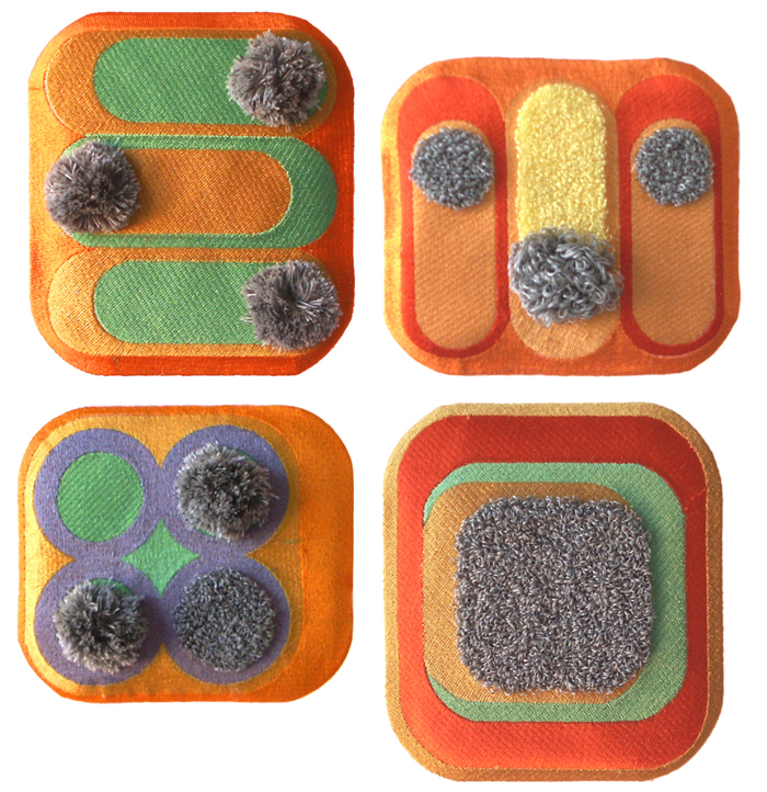 Media: Hand-made conductive sensors from conductive yarns, rayon, machine embroidery, acrylic. 3"w x 4"h.