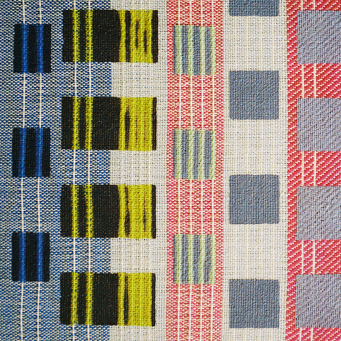 Media: Hand-woven cotton, rayon, conductive yarns, silver ink, thermochromic ink, custom drive electronics and expressive software. Sixty-four pixels, or color change areas. 26"w x 48"h. With Joey Berzowska. Private Commission This early color change textile took a compositional and painterly approach to the medium of color change textiles. The work uses brightly colored plain weave and twill combined with brightly colored, printed ink. In some case the ink changes color or value to match the woven background color next to it. This creates spatial shifts from background to foreground. Over 100 unique colors were mixed and applied to the textile. I have included a couple of studio shots to illustate how the peices were made, and how the approach of combining exposed woven textile with printed ink developed. Studio shot 1 shows an early prototype in which the entire peice was coated with ink. Unforntuately, the ink at this time was not an aesthetically satisifying material, so I chose to leave large areas of the woven textile unprinted. This style persisted in later works even after I improved the quality of the ink.