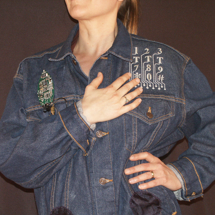 With Emily Copper, Rehmi Post, Joshua Smith, and Joshua Strickon. Media: Machine embroidered resistive yarns, metallic silk organza power and data bus, custom sensing electronics, speakers, custom MIDI synthesizer, and batteries. 24"w x 40"h. link to video The Musical Jacket is a wearable stand-alone musical instrument. It contains a wearable MIDI synthesizer; batteries; a fabric data, power and audio bus; and an embroidered keypad. Touch the embrodiered keypad to play music. The keypad uses a capacitive sensing method to sense touch. The sensing electronics place a small electrical charge on each number embroidered with conductive thread. When the wearer touches the embroidered number, his/her body draws the charge to ground. The electronics sense this change and trigger a musical event.