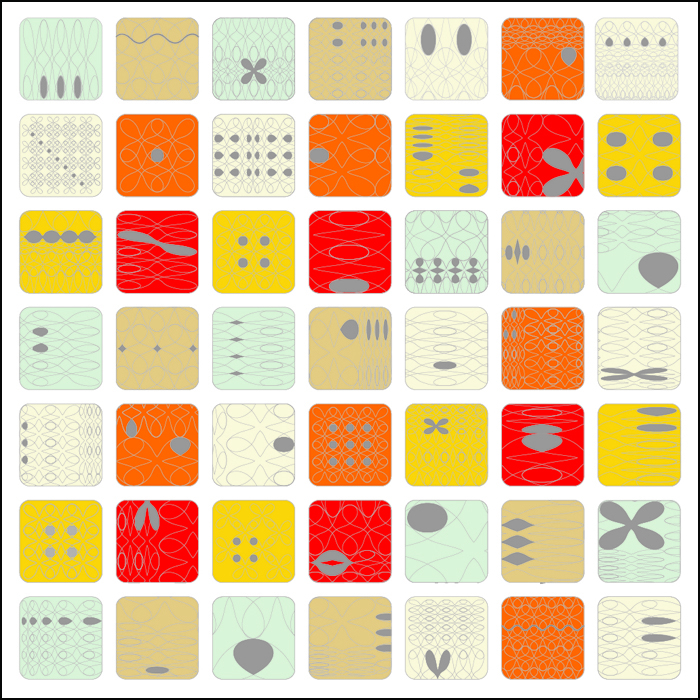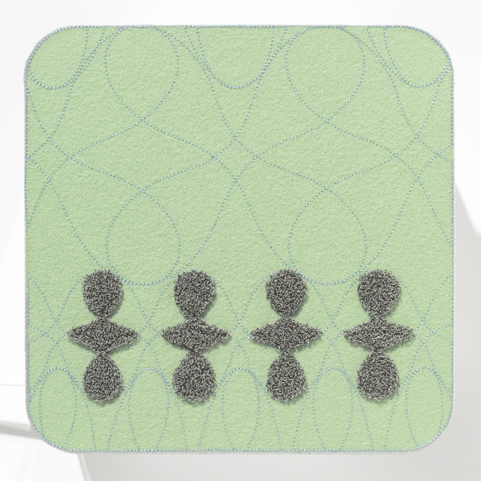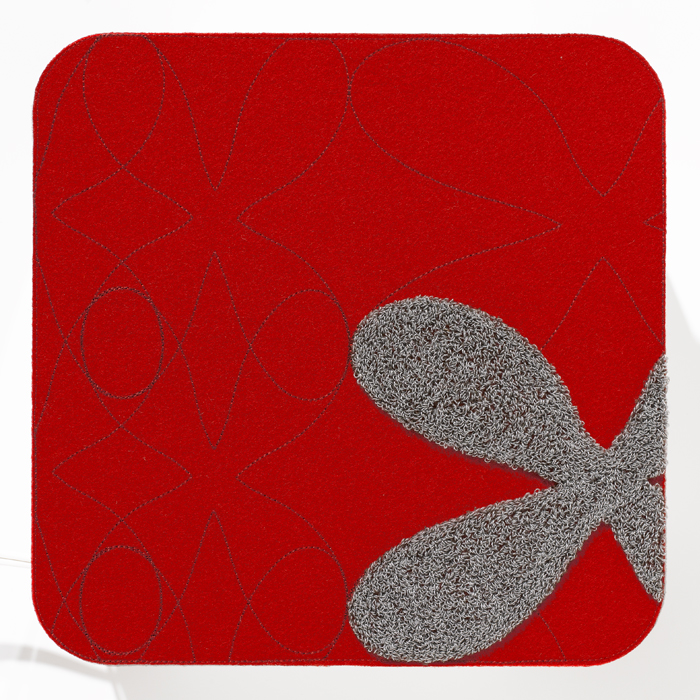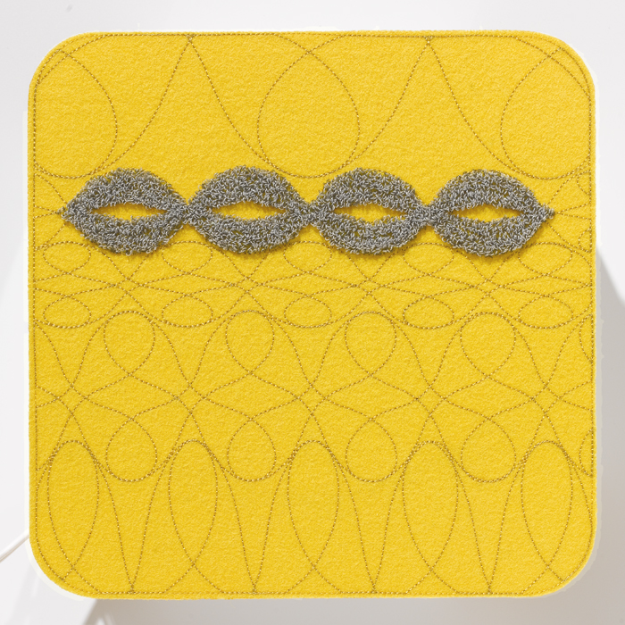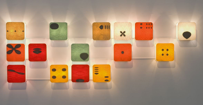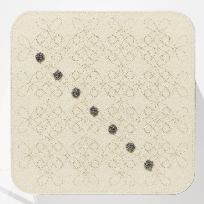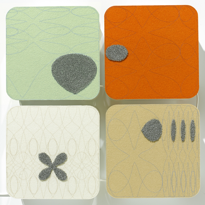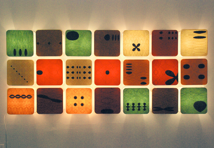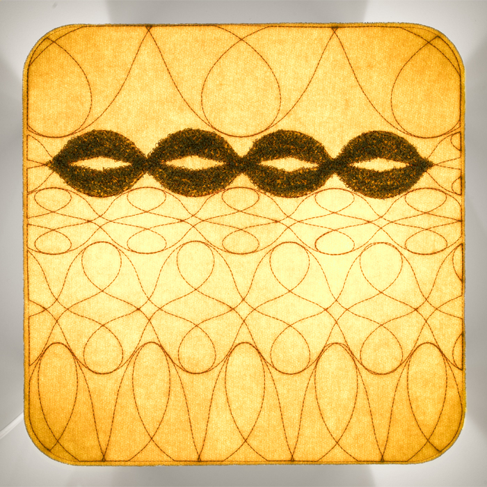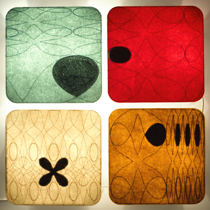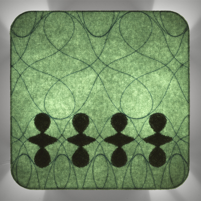 These light boxes explore the hidden electrical and transmissive properties of textiles. Each pattern is machine embroidered on DesignTex wool felt and hand tufted with electronic yarns. When viewers touch the tufted, electronic-textile sensor area of each pattern (the sensor), the felt and embroidered yarns are illuminated from behind, revealing the transmissive properties of the textile. Forty-nine unique patterns - all derived from a single motif - are available, in numerous configurations. Each pattern is limited to an edition of twelve.