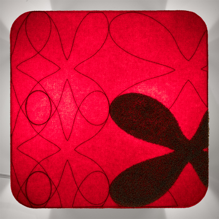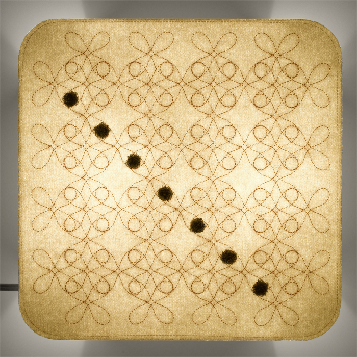 Media: DesignTex wool felt, machine embroidered rayon yarns, hand tufted conductive yarns, acrylic, lamp and electrical parts. Individual units: 11"w x 11"h x 5"d.Manufactured by hand at IFM.