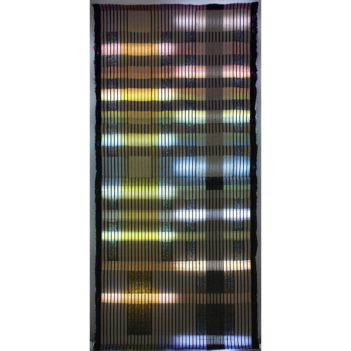 Media: Hand-woven cotton, rayon, conductive yarns, silver ink, thermochromic ink, drive electronics and software. 62" x 54" x 8".
